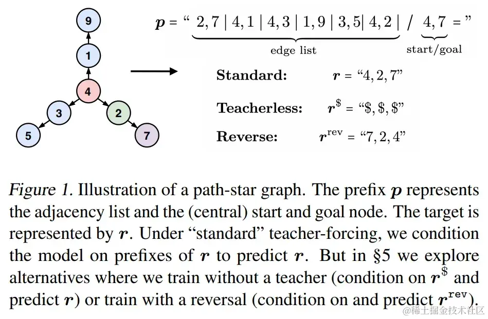 为了更好地表述本文的论点所在,作者设计了一个图的简单寻路问题,深刻地抓住了解决前瞻性问题的核心本质。这项任务本身很容易解决,所以任何失误都会非常直观地体现出来。作者将这个例子视为其论点的模板,该论点覆盖了 teacher forcing 下的前瞻性问题中的更一般、更困难的问题。