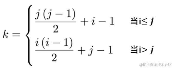 对称矩阵的实现过程是:将各元素所在的行标 i 和列标 j 代入公式,得到数组中的地址 k。