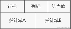 行标(row)、列标(col)、数据域分量(val)、指向下方结点的指针 A(rhead)、指向右方结点的指针 B(chead)。