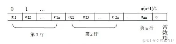 这样,就可以将 n2个元素压缩存储到 n(n+1)/2 个元素的空间中。以行序为主序存储其下三角 + 对角线的元素。
