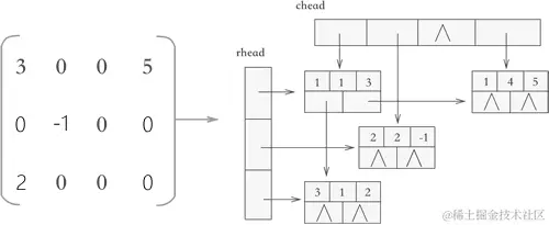 使用十字链表压缩存储稀疏矩阵时,矩阵中的各行各列都各用一个链表存储,与此同时,所有行链表的表头存储到一个数组(rhead),所有列链表的表头存储到另一个数组(chead)中。