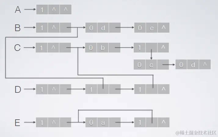 - B = (d, e):B 的元素全是原子,d 和 e,⻓度为 2,深度为 1。