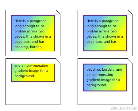 碎片溢出(Fragmentation Overflow)还有一个continue属性。该属性有点类似一起CSS片段模块(CSS Fragmentation Module Level 3)中的box-decoration-break属性。可以将不适合的内容进行分割,并为剩余的内容应该继续的位置提供替代方案。有点类似下图这样的: