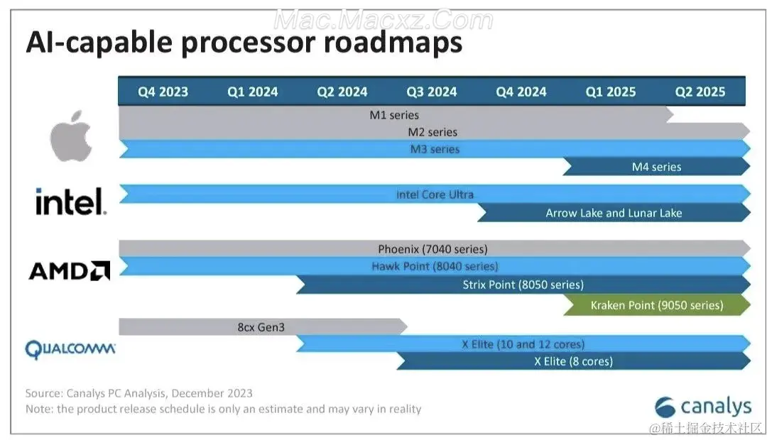 Canalys 绘制的 AI 处理器路线图显示,苹果公司将于 2025 年第 1 季度推出 M4 系列芯片,并认为该系列芯片主打 AI 功能。