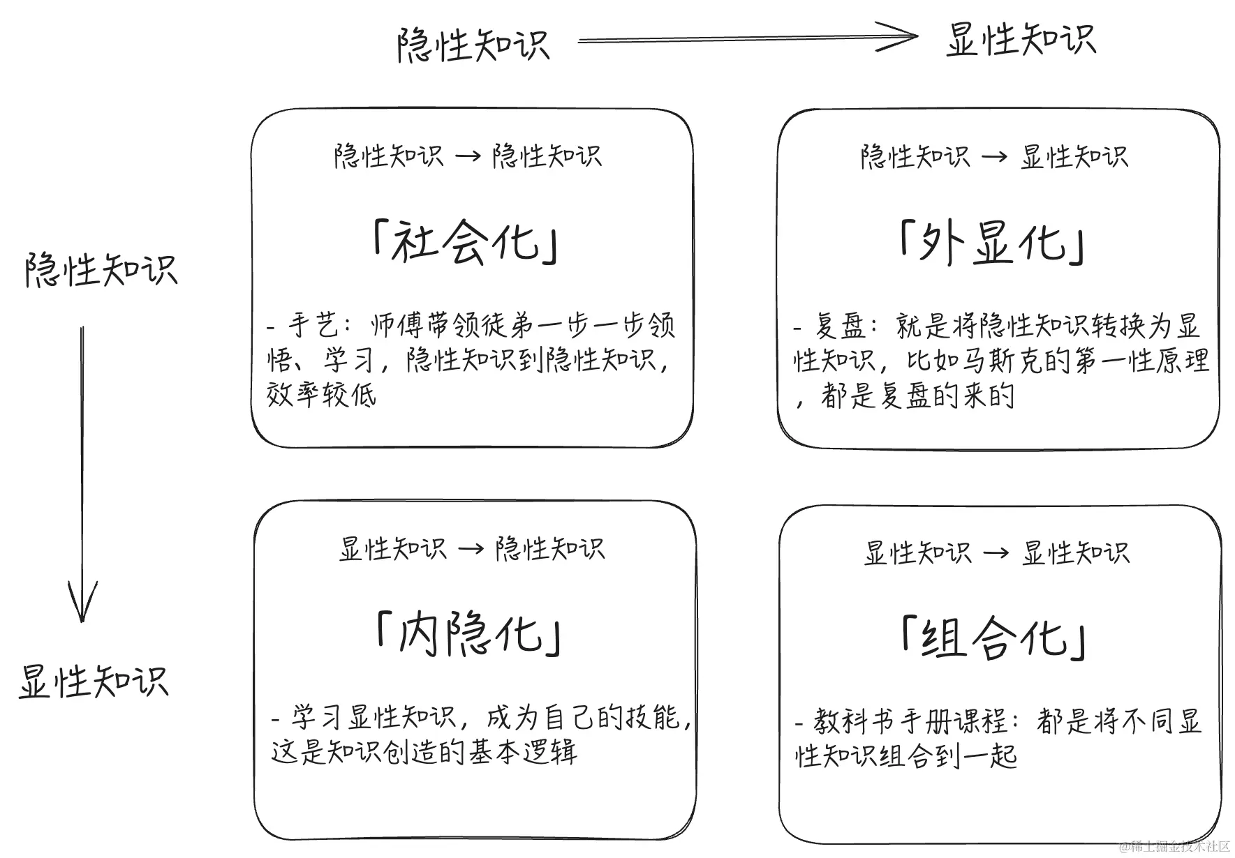 复盘,将隐性知识转换为显性知识(外显化),多次复盘之后,又能把显性知识组合在一起(组合化),成员各自学习,内化成自己的隐性技能(内隐化)。