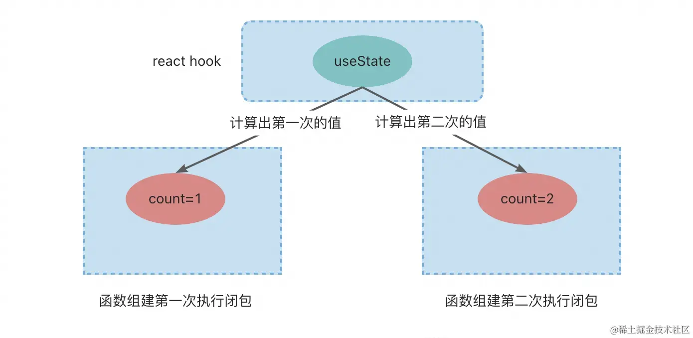 这种方式生效的原因是尽管我们词法环境并没有发生变化,但是我们每次触发setCount时使用的不再是词法环境中保存的那个count了,而是React获取了上一次的状态。