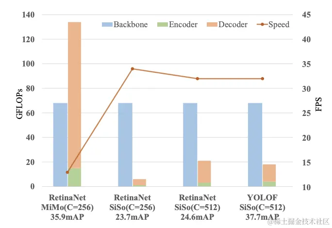MiMo encoder使得检测器更复杂,带来更大内存使用,造成检测速度下降。为了弄清楚这一影响,论文基于RetinaNet对MiMo encoder进行了量化分析,将检测过程分解成了上图的3个关键模块。