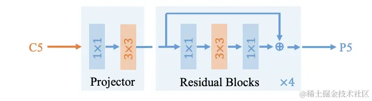 为了实现上述目的,论文设计了Dilated Encoder,分为Projector和Residual Blocks两部分。Projector结构跟FPN一样,先通过卷积降低维度,然后通过卷积来修复上下文信息,此处的卷积后跟BN层。随后堆叠连续4个不同dilation rates的dilated residual blocks,生成包含多种感受域大小的特征,此处的卷积后跟BN层+ReLU层。
