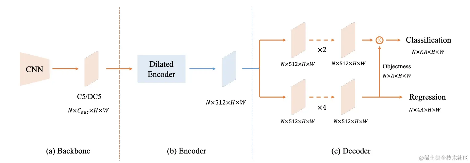 - Encoder:采用dilated encoder结构,projector输出维度为512,后续经过连续的dilated residual blocks处理,其中的卷积下采样率为4。