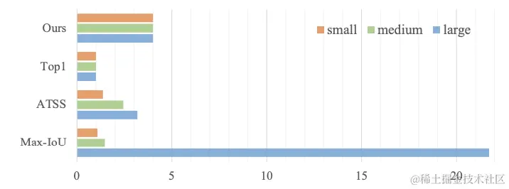 但由于SiSo encoder只有单层特征,anchor数从100k下降到了5k,而且C5下采样率较大,在C5上预设的anchor映射回原图就显得较为“稀疏”。如上图所示,大目标相对于小目标匹配到更多正样本,造成正样本不平衡的问题。不平衡问题使得检测器在训练时会更关注大目标的学习,忽略了小目标。