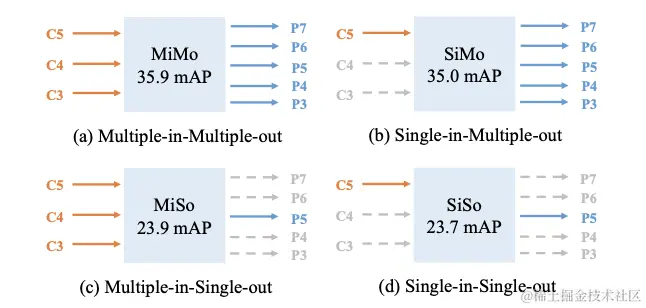 本篇论文的主要目的就是在one-stage检测算法上验证FPN的两个收益的影响,对这两种收益进行不同的组合,设计了Multiple-in-Multiple-out (MiMo)、Single-inMultiple-out (SiMo)、Multiple-in-Single-out (MiSo)和Single-in-Single-out (SiSo)四种encoder结构,如上图所示。将上述四种结构嵌入到RetinaNet中进行实验对比,其中MiMo就是原版的RetinaNet。比较意外的是,SiMo encoder的性能居然和MiMo encoder相差不到1mAP,而SiSo encoder与MiSo encoder则相差12mAP以上。