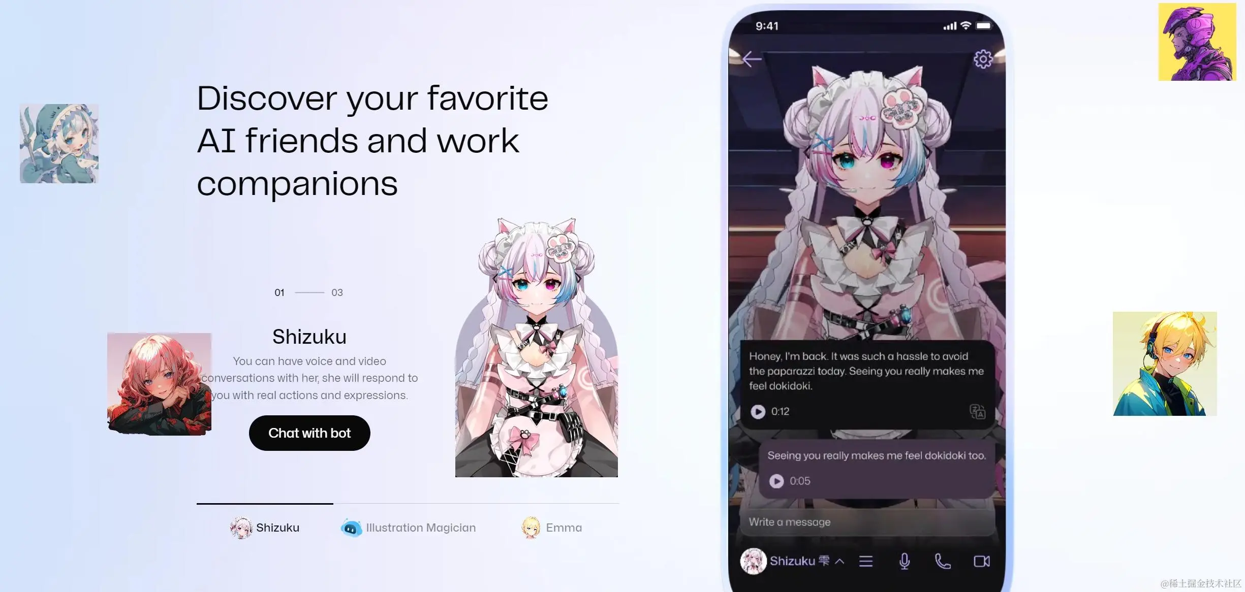 MyShell 官网展示的一个聊天机器人示例 Shizuku,「你可以和她进行语音和视频对话,她会用真实的动作和表情来回应你」。
