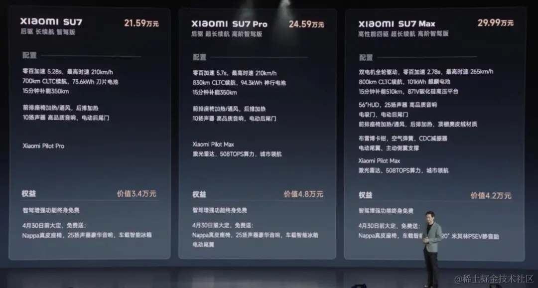 小米SU7:21.59万元起,小米SU7 Pro:24.59万元起,小米SU7 Max:29.99万元起 。