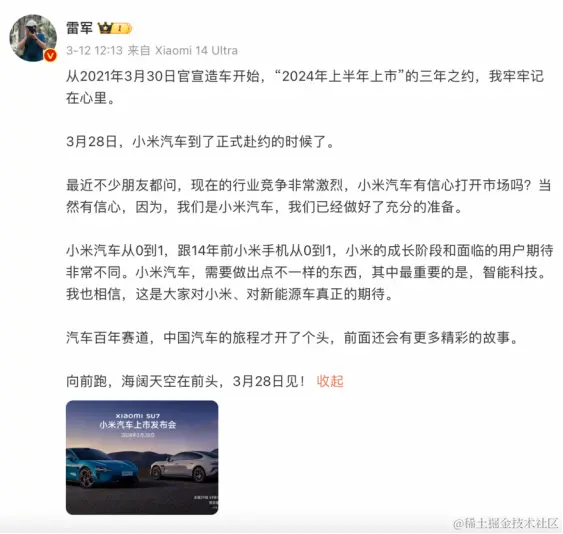 3月12日,雷军在其个人微博宣布,小米将在3月28日正式发布首款汽车小米SU7,并公布其售价。为了这场约定,雷军和小米已经准备了1000多天。随着官宣日期的临近,市场对于小米SU7的期待之情也逐渐被推向顶峰。