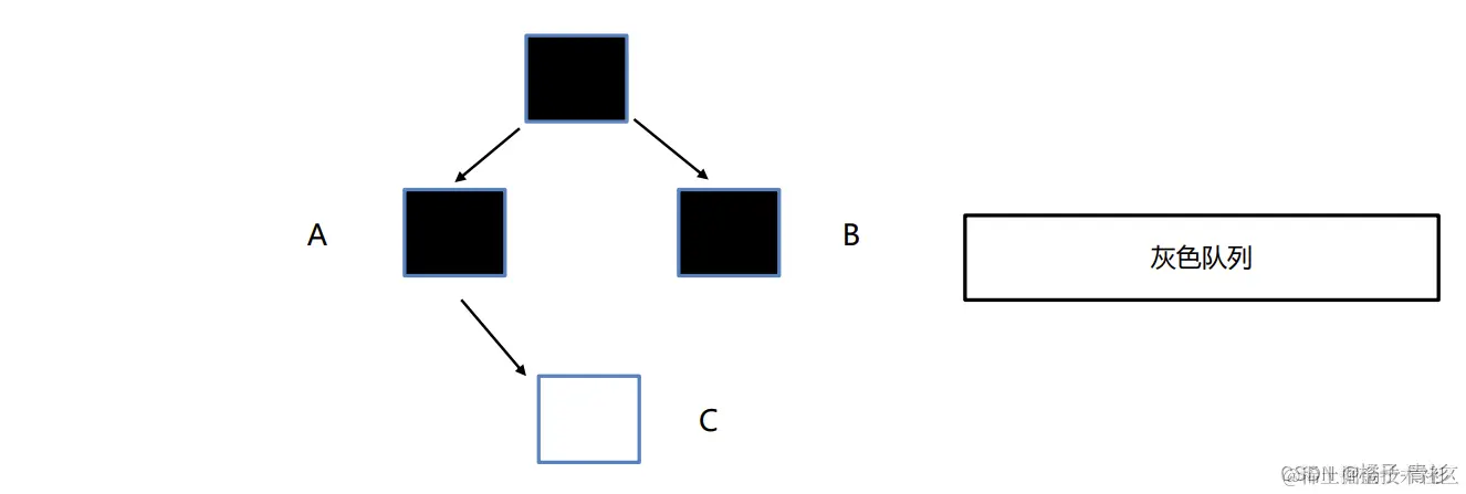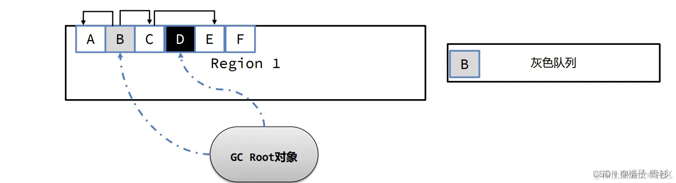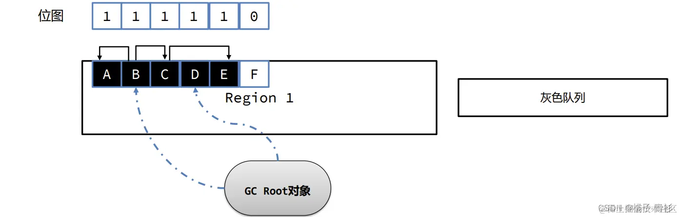 - 灰色:表示当前对象在GC Root的引用链上,但其引用的其他对象可能尚未被标记。灰色对象不会直接体现在位图中,而是被放入一个专门的队列中,等待后续处理。