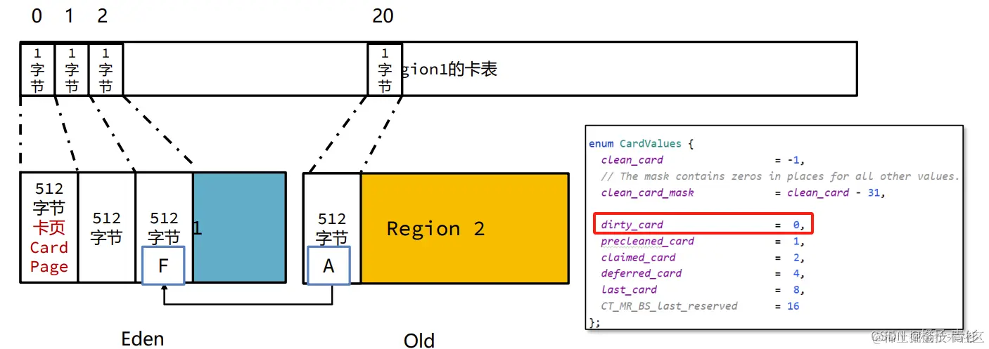 每一个Region都配备有一个独立的卡表(Card Table),用于记录该Region中对象的跨代引用情况。当发生从老年代到年轻代的跨代引用时,相应Region的卡表会相应地更新其字节内容。在JDK 8的源码中,如果某个字节被标记为0,这表示该字节所代表的内存块被老年代对象所引用,这种情况被称为“脏卡”。通过这种方式,能够精准地识别出哪些老年代的部分引用了当前Region中的对象。
