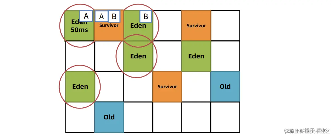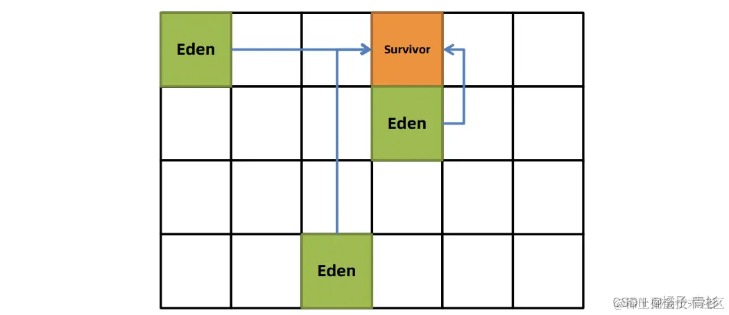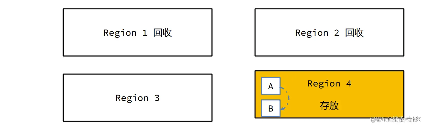 - 3.对象复制与区域清空:根据预设的最大暂停时间和其他配置参数,G1选择某些区域,将存活对象复制到一个新的Survivor区(对象的年龄加1),并清空这些区域。