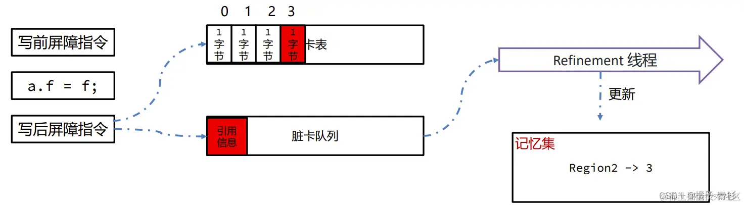 - 捕获引用变更信息:首先,JVM利用写屏障技术来捕获所有涉及跨代引用的变更信息。写屏障是一种在对象引用写入时触发的机制,它能够拦截这些操作并提取必要的引用信息。