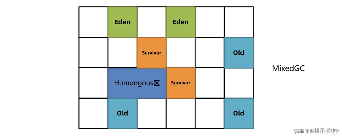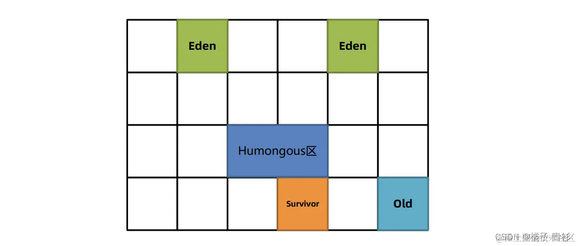 - 6.老年代与Humongous区:当某个对象的年龄达到预设阈值(默认15)或其大小超过一个Region的一半时,该对象会被移入老年代。这些老年代被称为Humongous区。例如,在堆内存为4G、每个Region为2M的环境中,任何超过1M的对象都会被放入Humongous区。如果对象过大,可能会跨越多个Region。