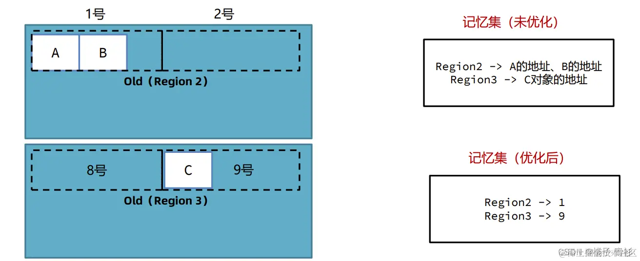 为了进一步优化内存使用,G1垃圾回收器采用了分块记录的策略。它将每个区域中的内存按照一定大小划分成多个块,并为每个块分配一个编号。在记忆集中,不再记录单个对象的引用关系,而是记录对块的引用关系。这样,即使一个块中包含多个对象,也只需要记录一次块的引用,从而显著减少了内存开销。