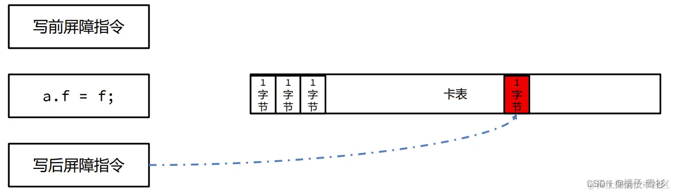 JVM采用写屏障(Write Barrier)技术来维护卡表,这种技术允许在执行涉及引用关系建立的代码时,在相应指令之前和之后插入特定的操作。这些插入的指令负责更新卡表的状态,确保卡表能够准确反映对象之间的跨代引用关系。