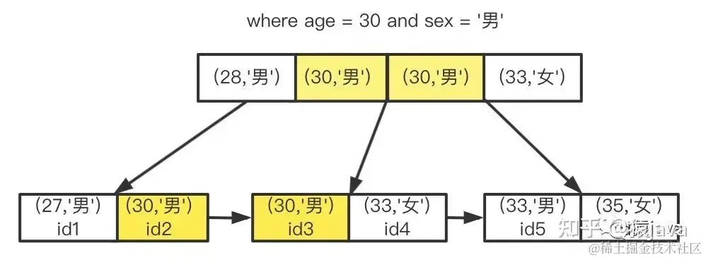 - 首先,从根节点根据组合索引里面的所有字段进行精确匹配查到到 age=30 and sex='男'的记录有两条;