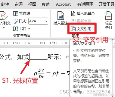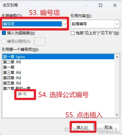 光标移动到需要插入引用公式序号的位置,点击【插入——交叉引用/引用——题注——交叉引用】——编号项——选择需要引用的公式编号: