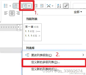 开始——段落——多级列表——定义新的多级列表(如果已经定义好了多级列表,将光标停留在其中一个列表项的所在段实现修改)