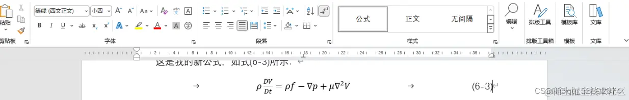 对其他行应用公式行的对齐,光标移动到需要设置对对齐的行,在样式栏中点击刚才设置的“公式”样式,即可完成对齐,若公式没有居中,请在公式前输入Tab制表符,在公式和标号间输入制表符