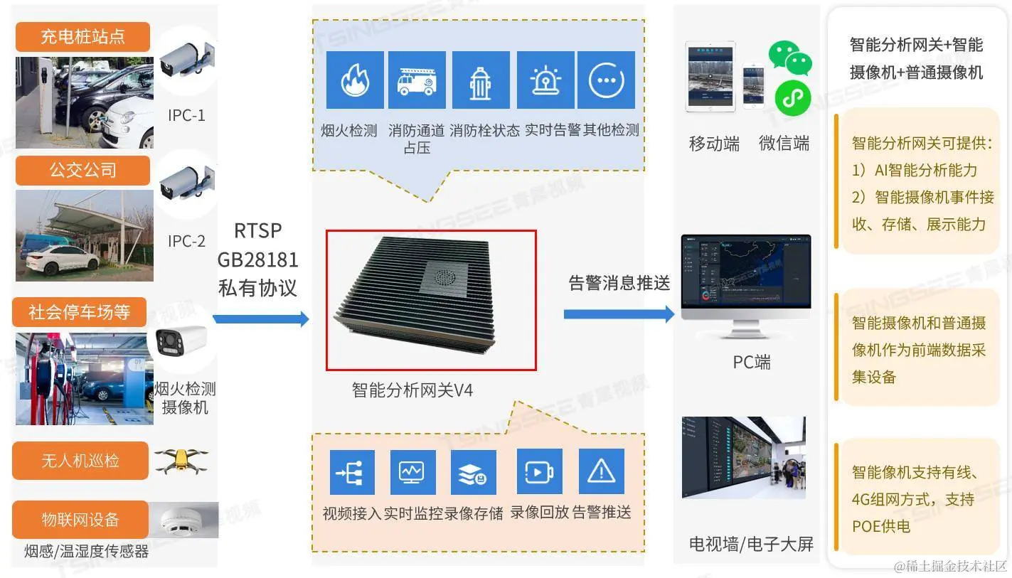 烟火识别能力可采用AI智能分析网关V4或者AI烟火探测摄像机,当检测到疑似烟雾、火焰、火点的场景时,将通过主动预警推送的方式,进行抓拍与告警,告警还能通过弹窗、提示音等方式提醒管理人员及时查看和处理。