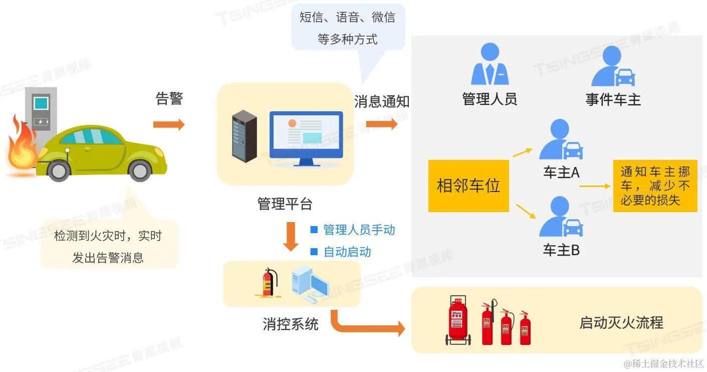利用AI烟火识别算法实时监测充电桩站点是否存在烟雾、火焰、火点,当识别到火患时,立即抓拍并上报告警至管理平台,提醒管理人员及时处理。
