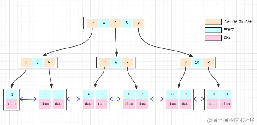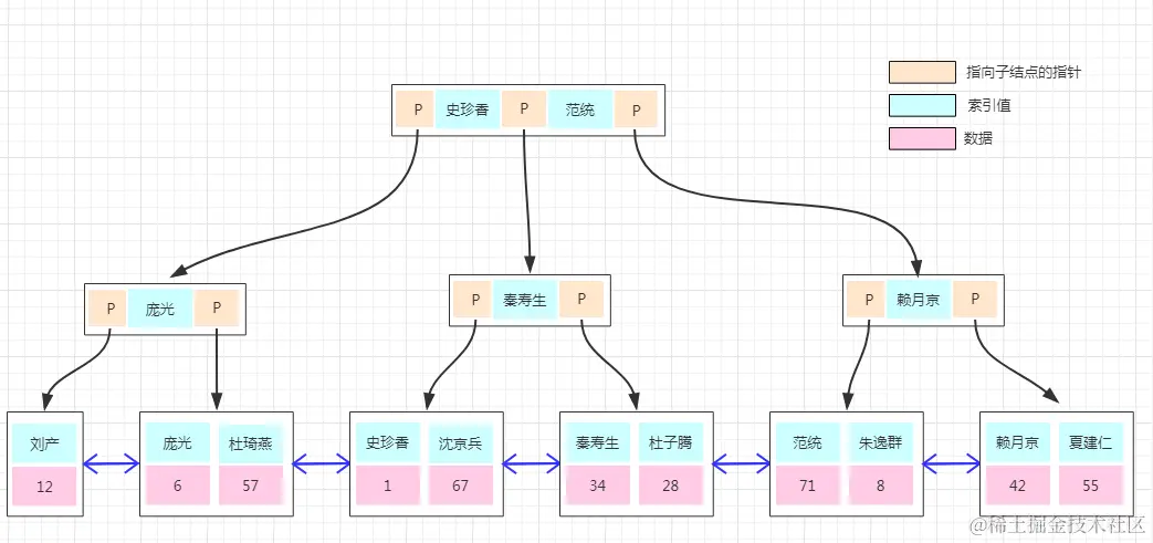 - 额外的指针被添加到树中。例如,每个叶子页面可以引用其左边和右边的兄弟页面,使得不用跳回父页面就能按顺序对键进行扫描。