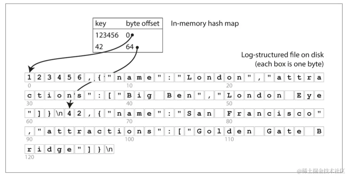 在编程中,一说起查询速度最快的数据结构就会想到哈希表。因此,可以考虑在内存中维护一个哈希表,K 为需要存储到数据库的 key,V 为需要存储到数据库中的 value 对应磁盘文件的偏移量。