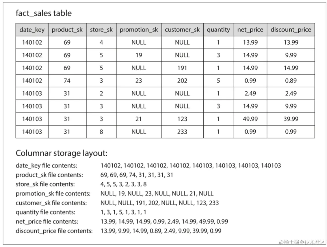 OLAP 的特点在于读取数据量大,且需要进行聚合运算。但是在分析的时候往往只需要聚合部分列。例如:分析人们是否倾向于在一周里的某一天购买新鲜水果或糖果。在这个例子中,会扫描全年的数据,但是查询的列只有三行。