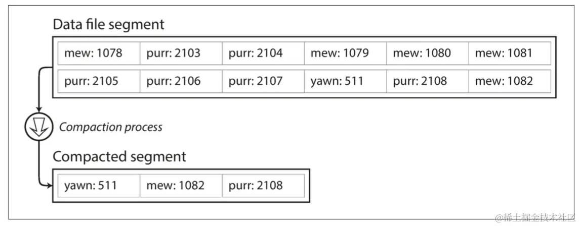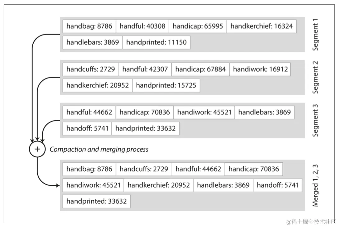 - 后台启动线程对 SSTable 进行合并与压缩,合并 SSTable 文件并将覆盖和删除 key 移除。由于每个分段文件均已经按照 key 排序,因此可以按照归并顺序将其归并了一个文件中。如果遇到相同的 key,则以最新文件的值为准。