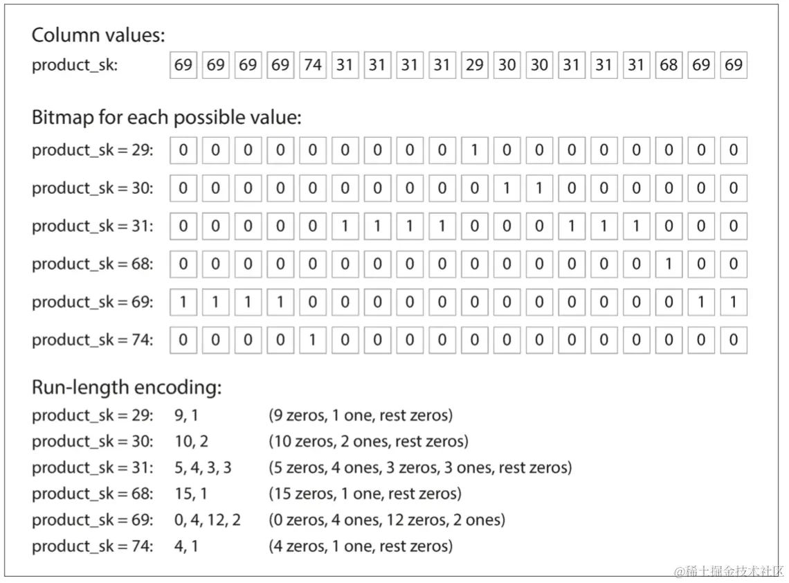 为了减少对磁盘的吞吐,通常数据进行压缩。使用列存储之后,由于列的数据格式是固定的,且存在大量的重复数据,更容易进行压缩处理。下面展示的是使用位图编码处理后的数据,由于位图编码后有大量的 0, 即数据是稀疏的。此时,可以在使用游程编码进行二次编码,使列的编码非常紧凑。