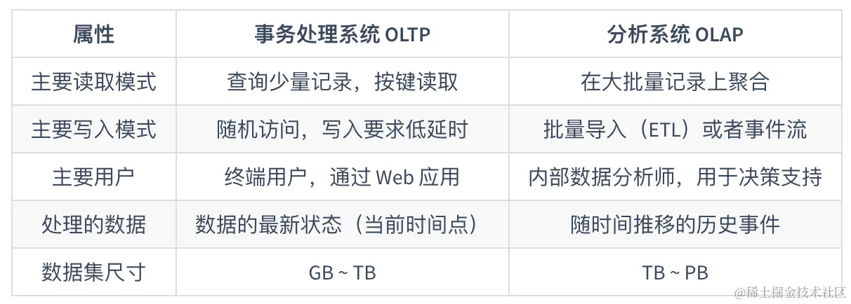 针对业务场景的不同,将数据库类型分为两类:OLTP 和 OLTP。OLTP:主要特点是查询的数据量少,对写入和查询的性能要求高。OLTP: 主要特点是需要读取大量的列才能计算最终的结果,对实时性要求不是很高。