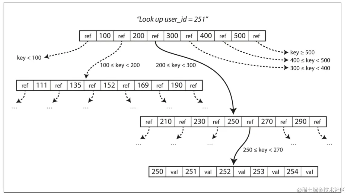 以查询 user_id = 251 为例子,先从根节点加载页面数据;寻找到[200,300)的节点地址;加载数据寻找[250,270)的数据;加载叶子结点;返回 user_id=251 的数据。