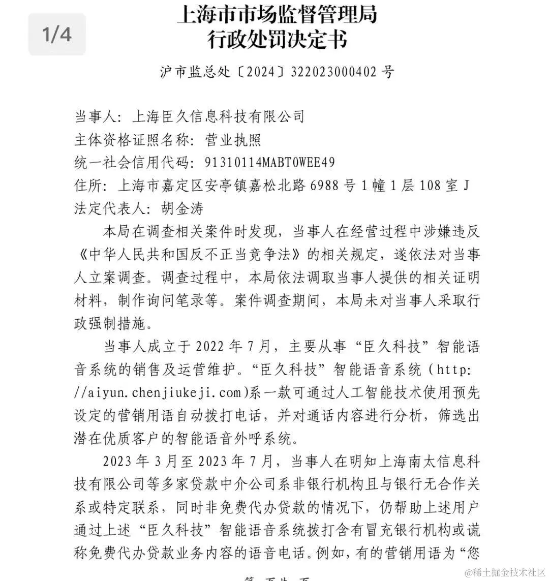 2024年1月9日,上海市市场监督管理局对上海俏聘网络信息科技有限公司作出处罚,上海俏聘成立于2016年10月,主要从事“斗星智能”、机器人语音AI外拨软件业务。2022年9月至2023年7月,上海俏聘在明知其13各从事贷款中介服务的企业及个人用户非银行机构,且与银行无合作关系,同时非免费代办贷款的情况下,仍帮助上述13个客户通过“斗星智能”机器人语音AI外拨软件使用自称银行机构名义或免费代办贷款话术模板,拨打语音电话,推销贷款中介服务。