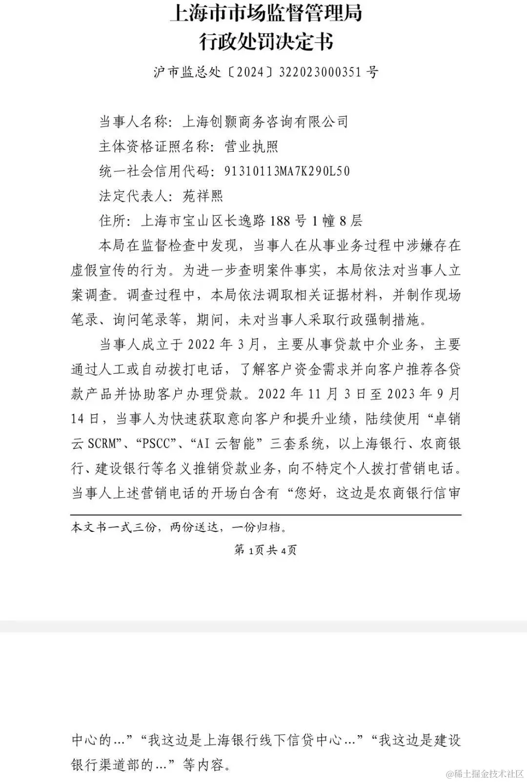 2024年1月10日,上海市市场监督管理局对上海创颢商务咨询有限公司作出行政处罚,该公司成立于2022年3月,主要从事贷款中介业务。2022年11月至2023年9月,该公司为快速获取意向客户和提升业务,陆续使用“卓销云SCRM”、“PSCC”、“AI云智能”三套系统,以上海银行、农商银行、建设银行等名义推销贷款业务,向不特定个人拨打营销电话。经查明,该贷款中介与上述银行均无合作。