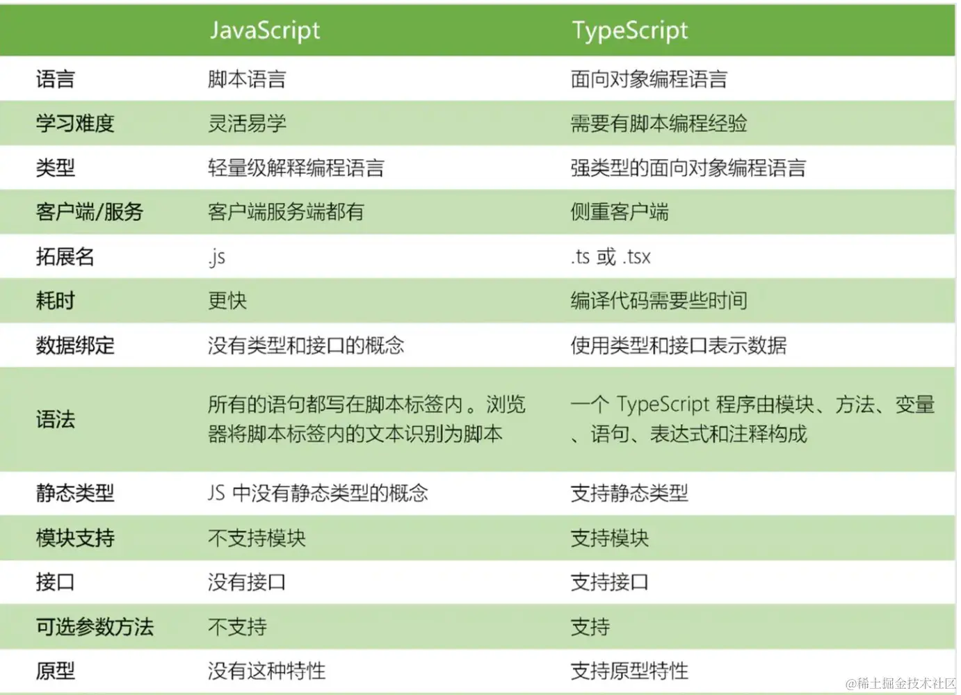 - TypeScript 是 JavaScript 的超集,扩展了 JavaScript 的语法