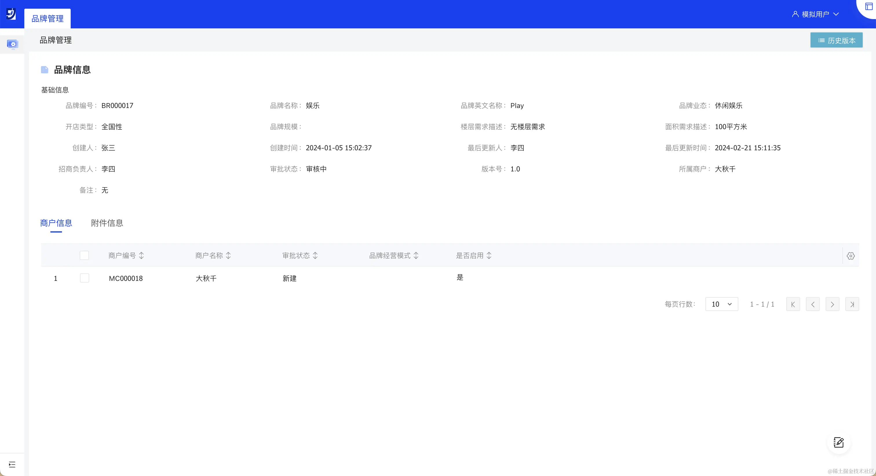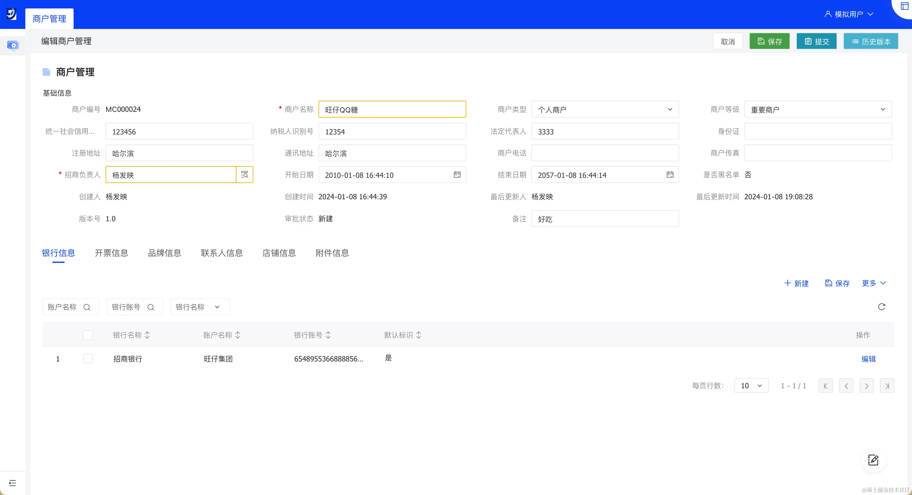 商户管理模块用于管理商业地产项目中的商户信息和商户的银行信息、开票信息、品牌信息等。该模块提供了商户档案管理、商户数据版本等功能。