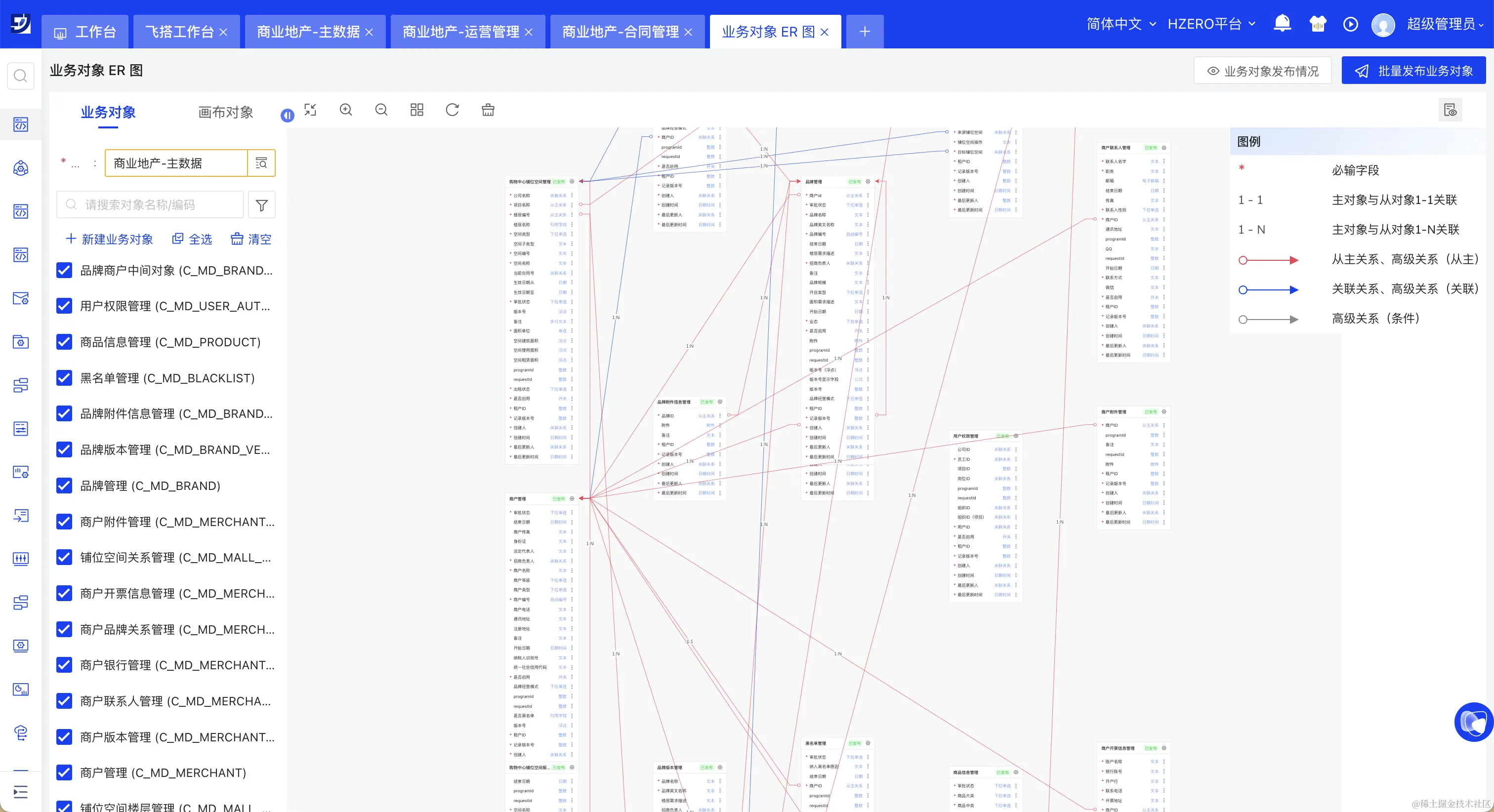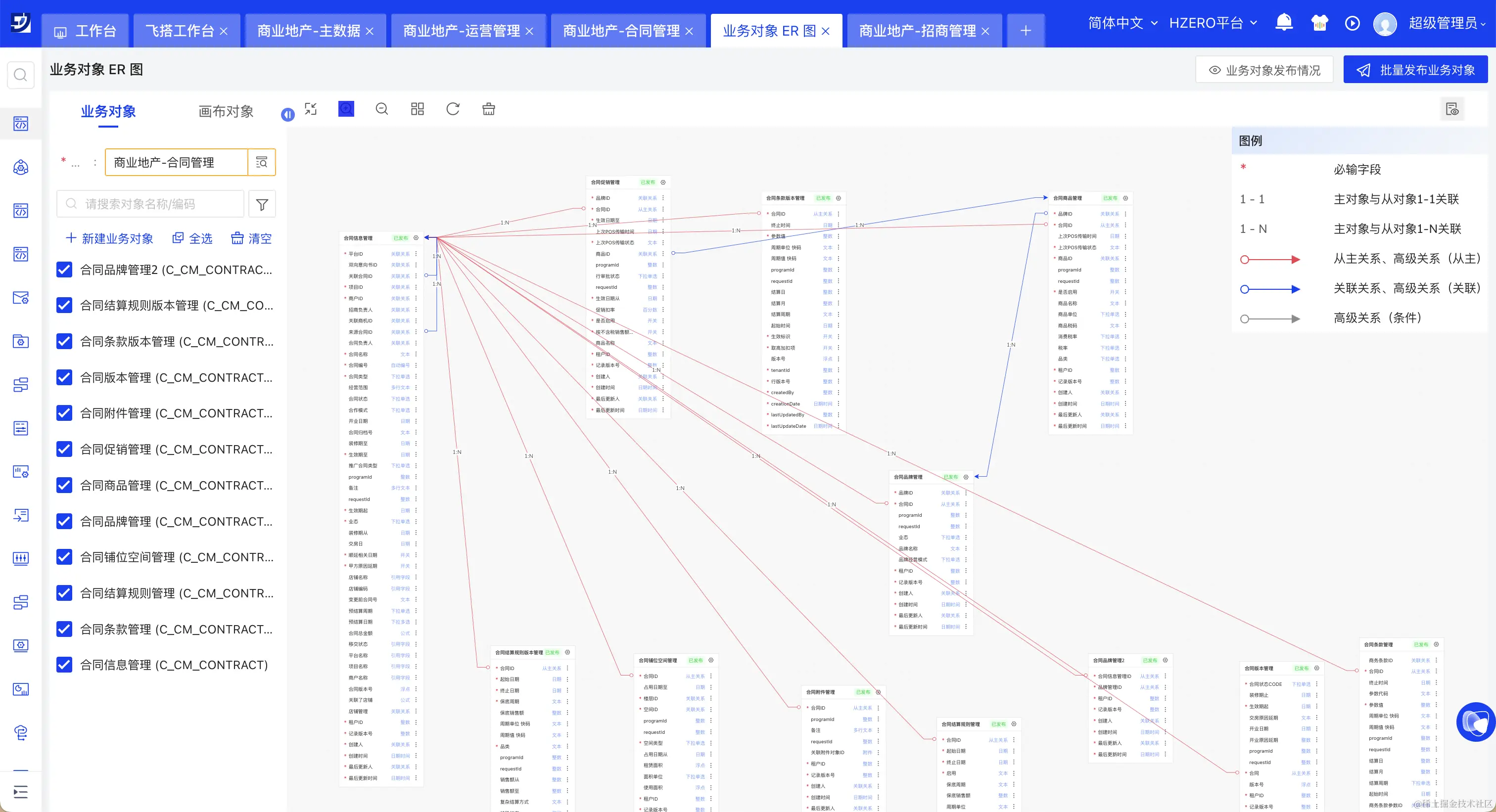 在招商管理的配置中,飞搭使用了28个业务对象。
