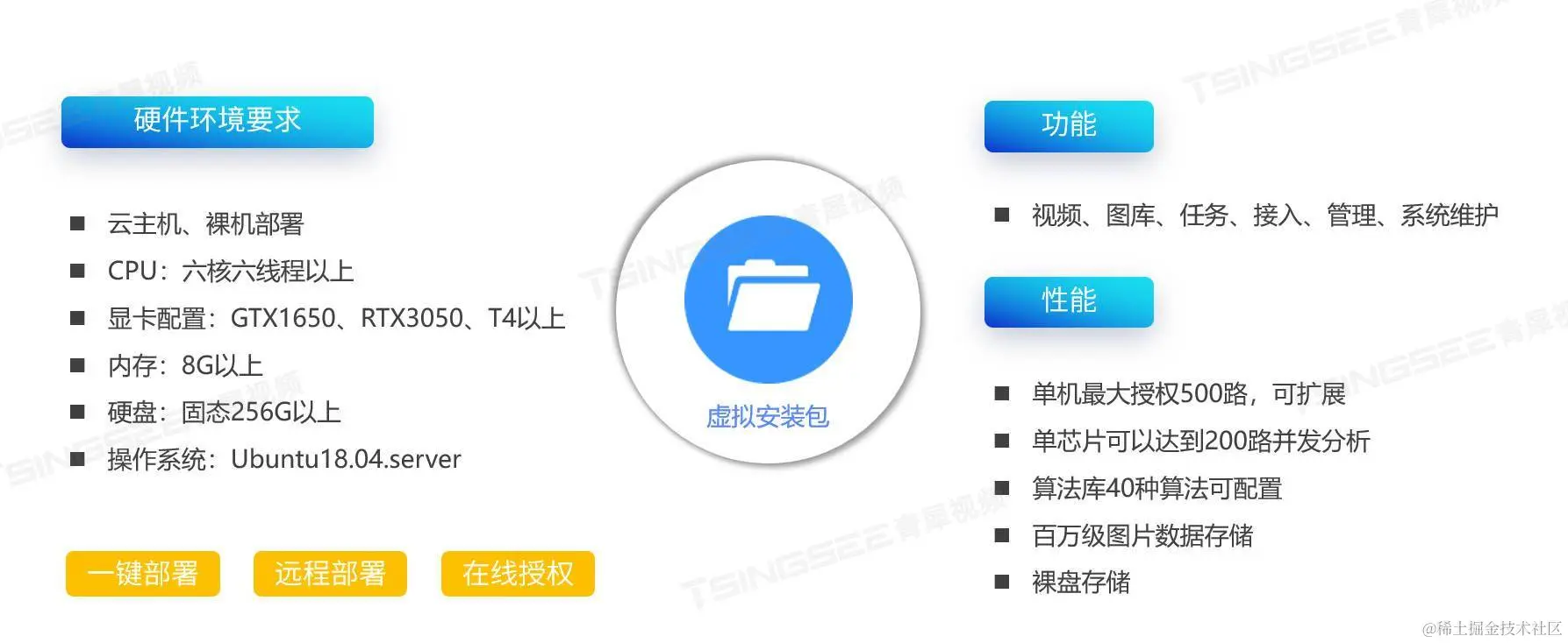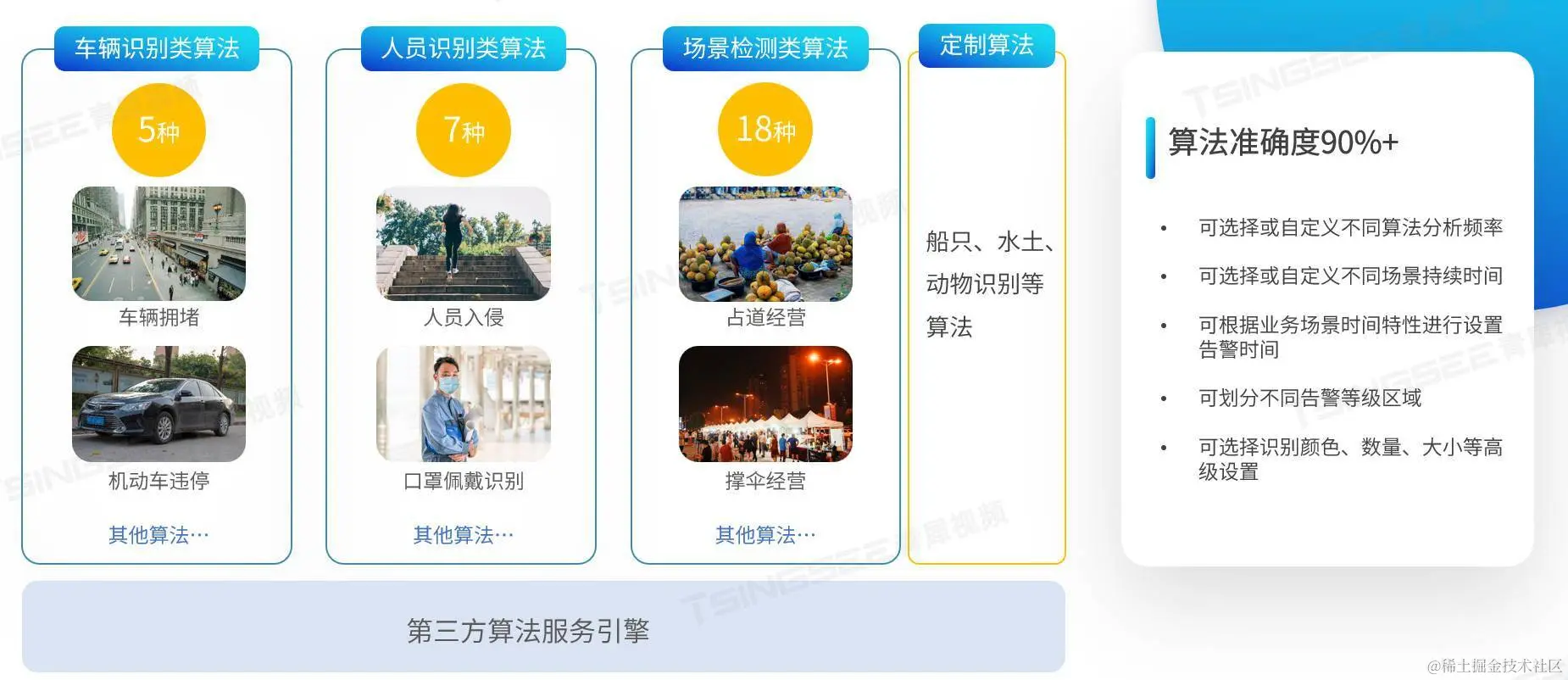TSINGSEE青犀AI算法中台是一款平台型产品,专注于提供各行业中小场景中部署解决方案。平台具备接入广、性能强、支持跨平台、芯片国产化等特点,可提供丰富的视图接入能力和智能分析能力。平台将不同类型、不同协议前端设备,支持通过不同网络环境进行传输、汇聚、处理,并能在平台内部进行智能分析,产出对应算法结果,最终实现统一调度、远程管理的综合性应用平台。