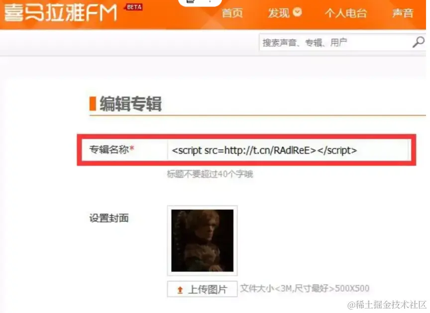 - 由于用户设置专辑名称时,服务器对关键字过滤不严格,比如可以将专辑名称设置为一段 JavaScript 脚本: