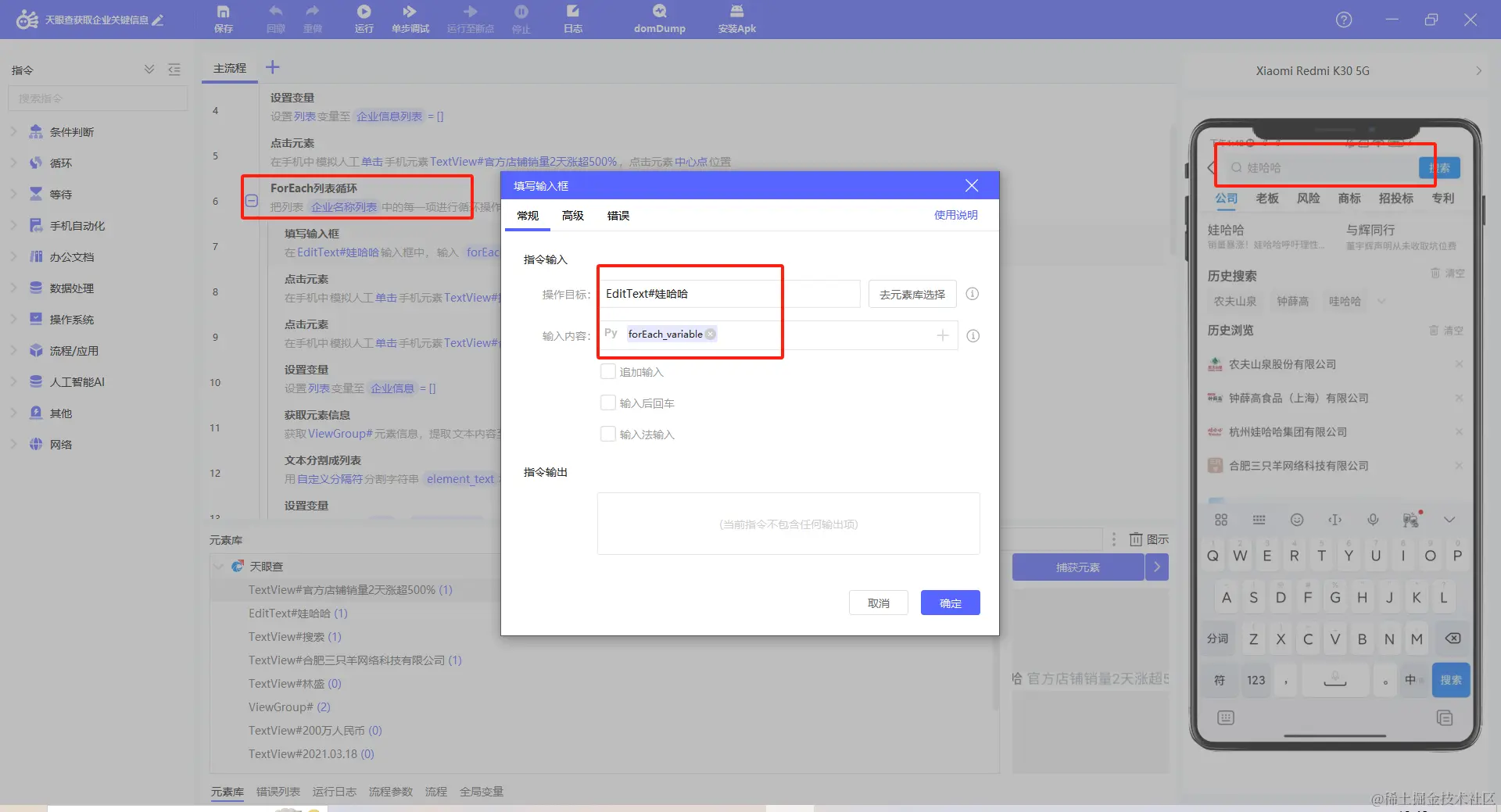 4.这里通过循环,取到待查询的企业名称,填写到目标元素中,我这里是填写到输入框中