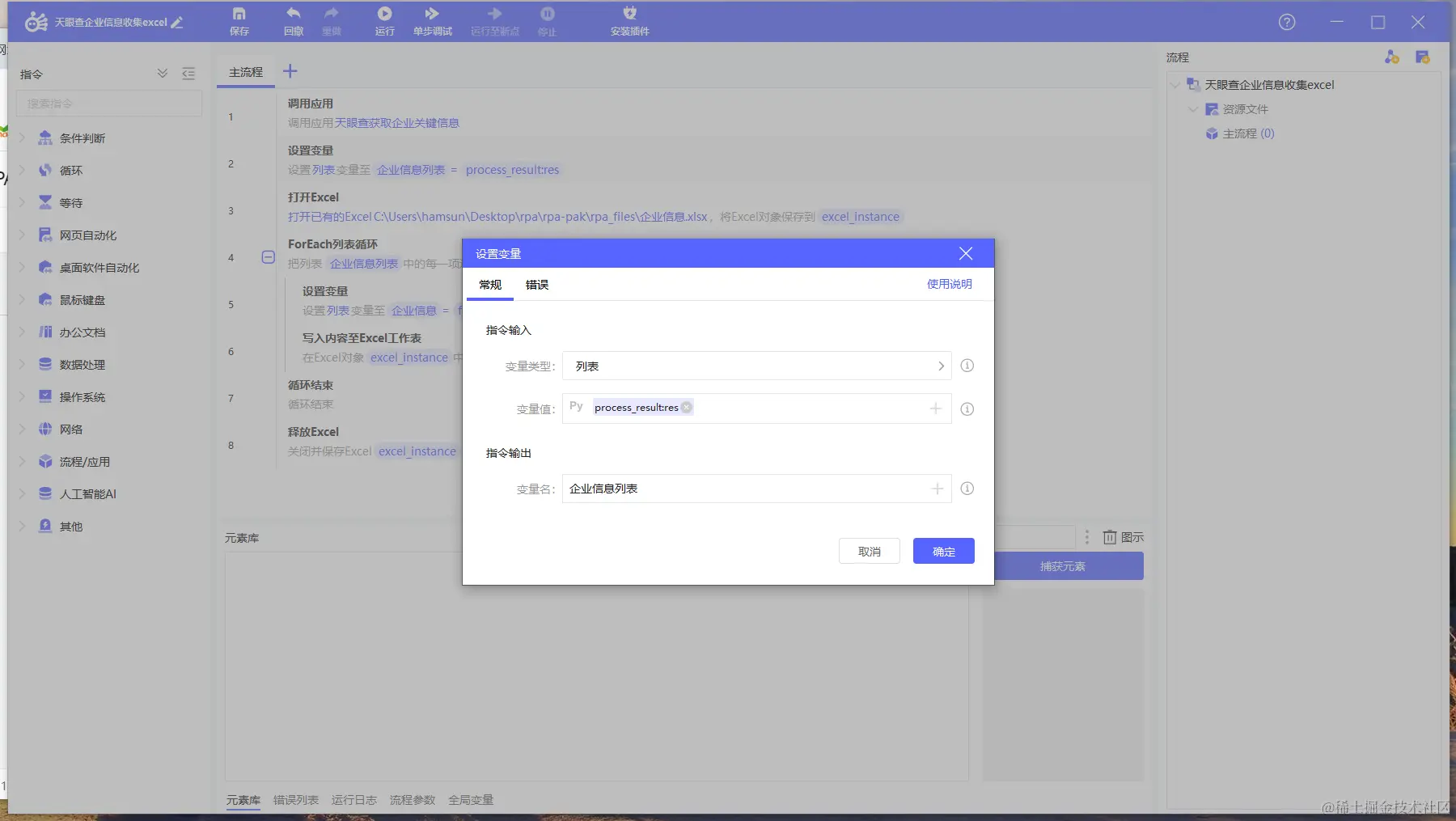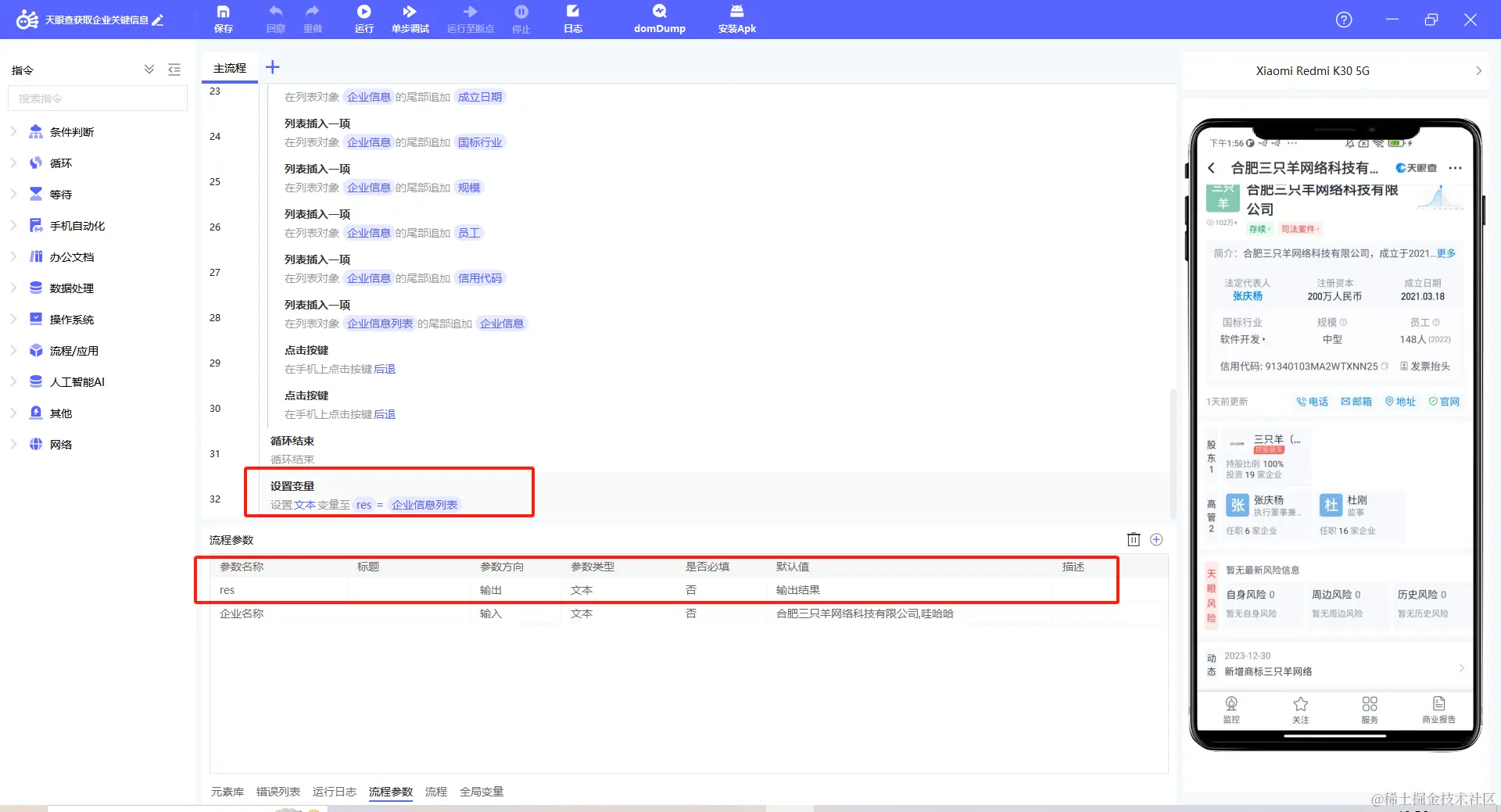 9.最后通过设置变量的形式将收集到的企业信息赋值给应用的输出参数