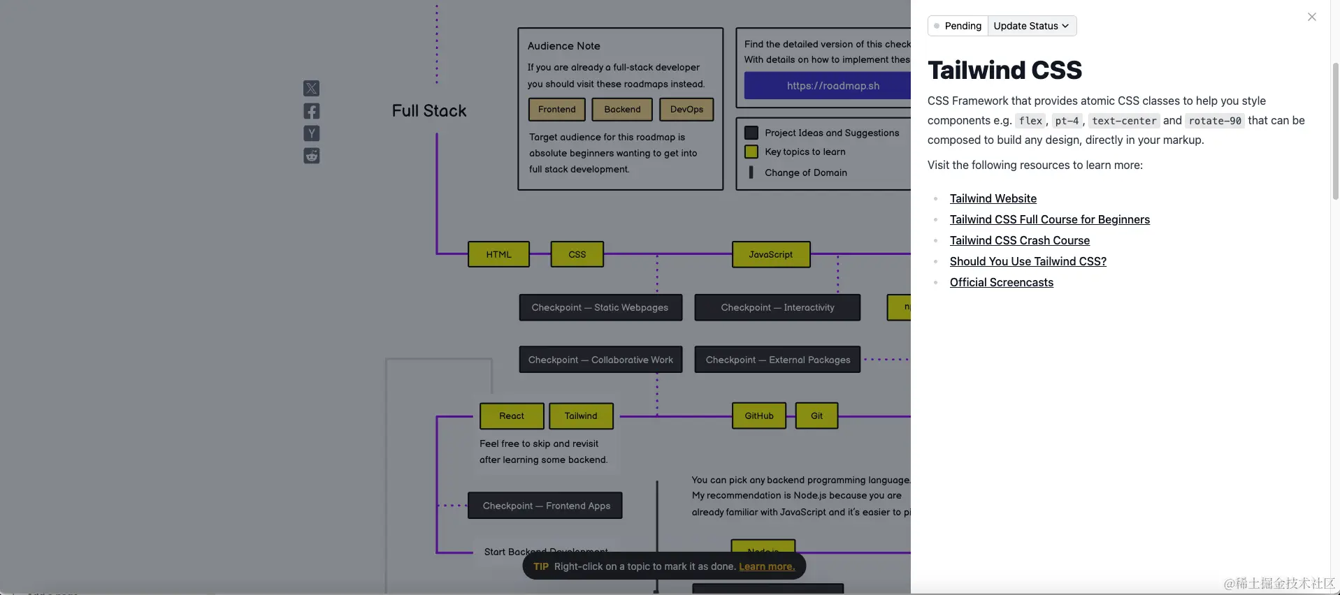 目前,这个roadmap不单单是一个图,它还具备交互能力,可以点击其中的每个部分,查看相关的内容,包括了整理的各种相关学习资源,比如在线书籍等。