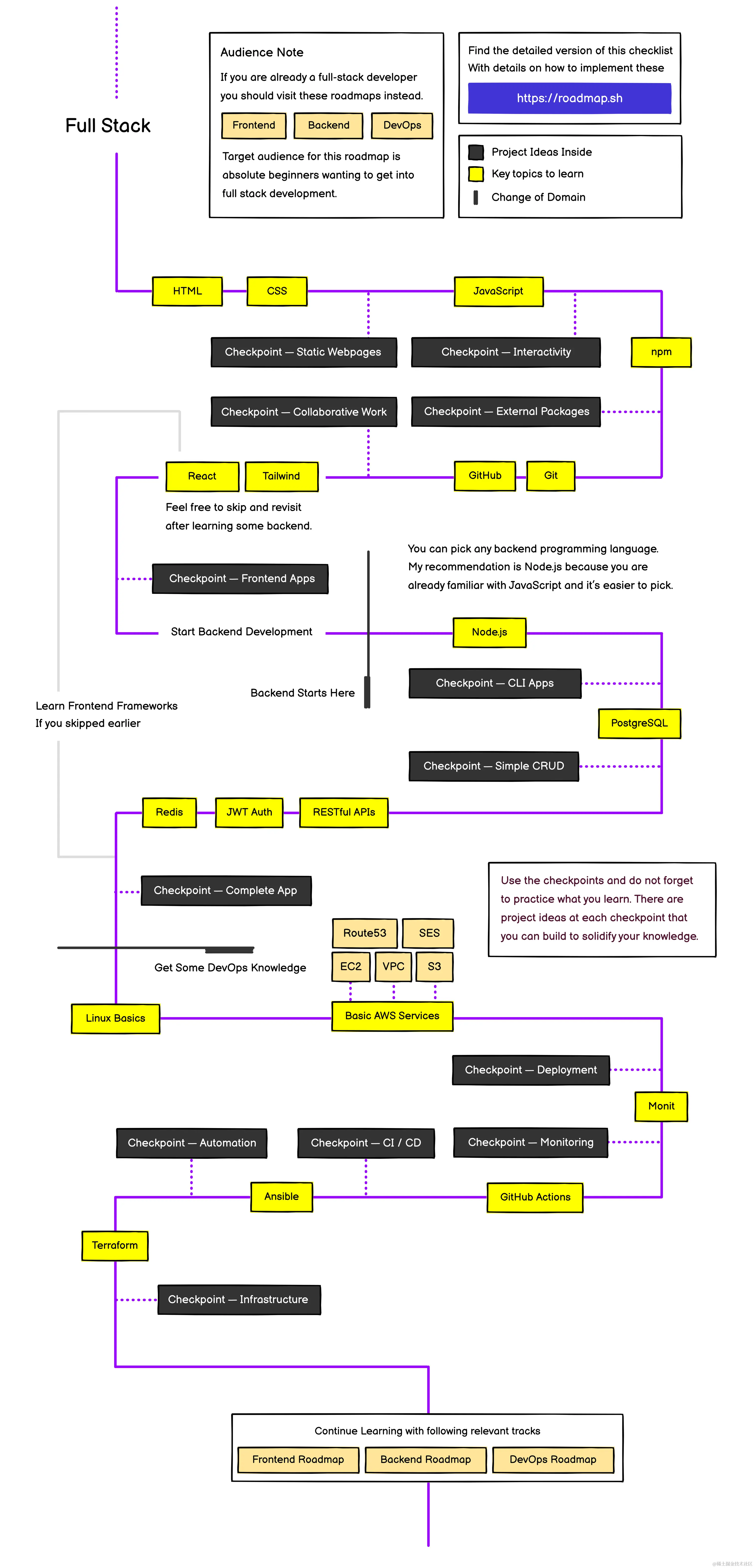 比如我们选择一个方向就可以查看roadmap,比如我这里选择了full stack,就会展示一个完整的full stack学习相关的roadmap,这个roadmap可以下载到本地。